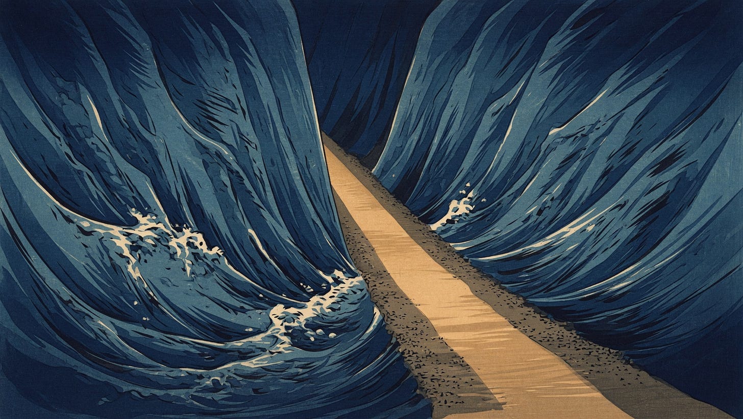 The pressurized chamber that had been building charge for 40 years of silence, finally opening. He walked back into Egypt with a cedar rod. He stood before Pharaoh. He stretched his hand over the sea and the sea opened.