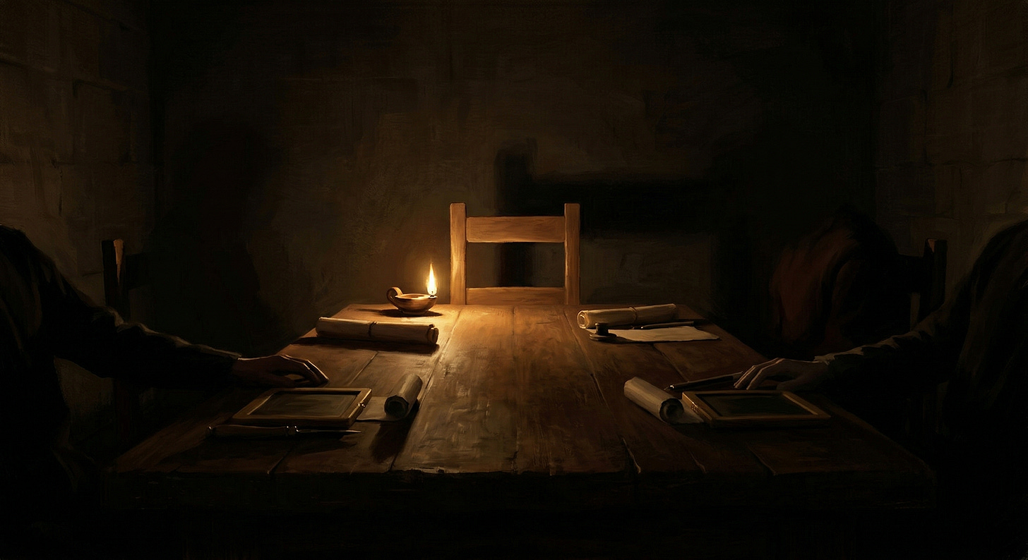 Six beings around a table with seven chairs. The seventh stood empty at the end. The name had not been spoken in this wing for forty years. They could disagree about the mission. They could not disagree about the chair.