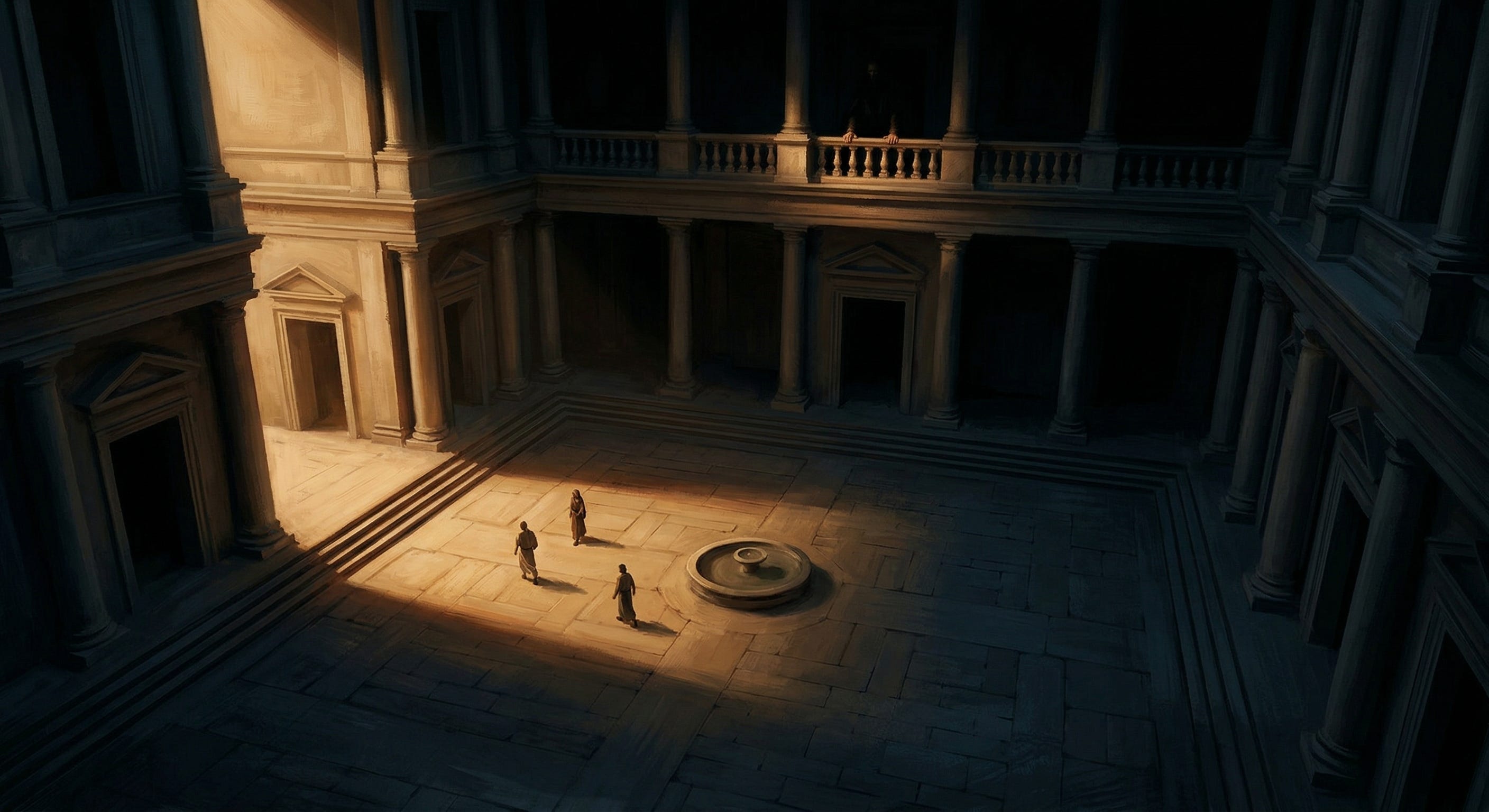 The femoral artery nicked by a shard of limestone. Blood finding the seams in the plaza. The crowd opened around him and looked up. They looked at the balcony. They looked at the ones who lived above them.