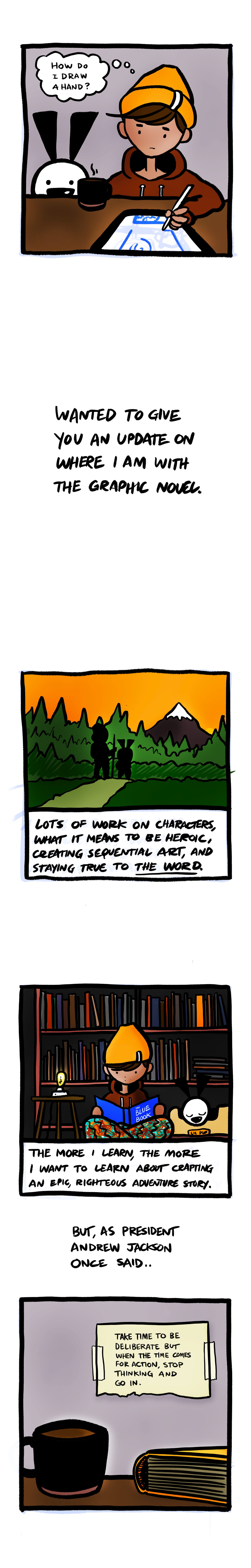 The development of The Last Book feels good. My entire story arc is outlined, with the first six chapters written, and the first ‘episode’ completely illustrated.