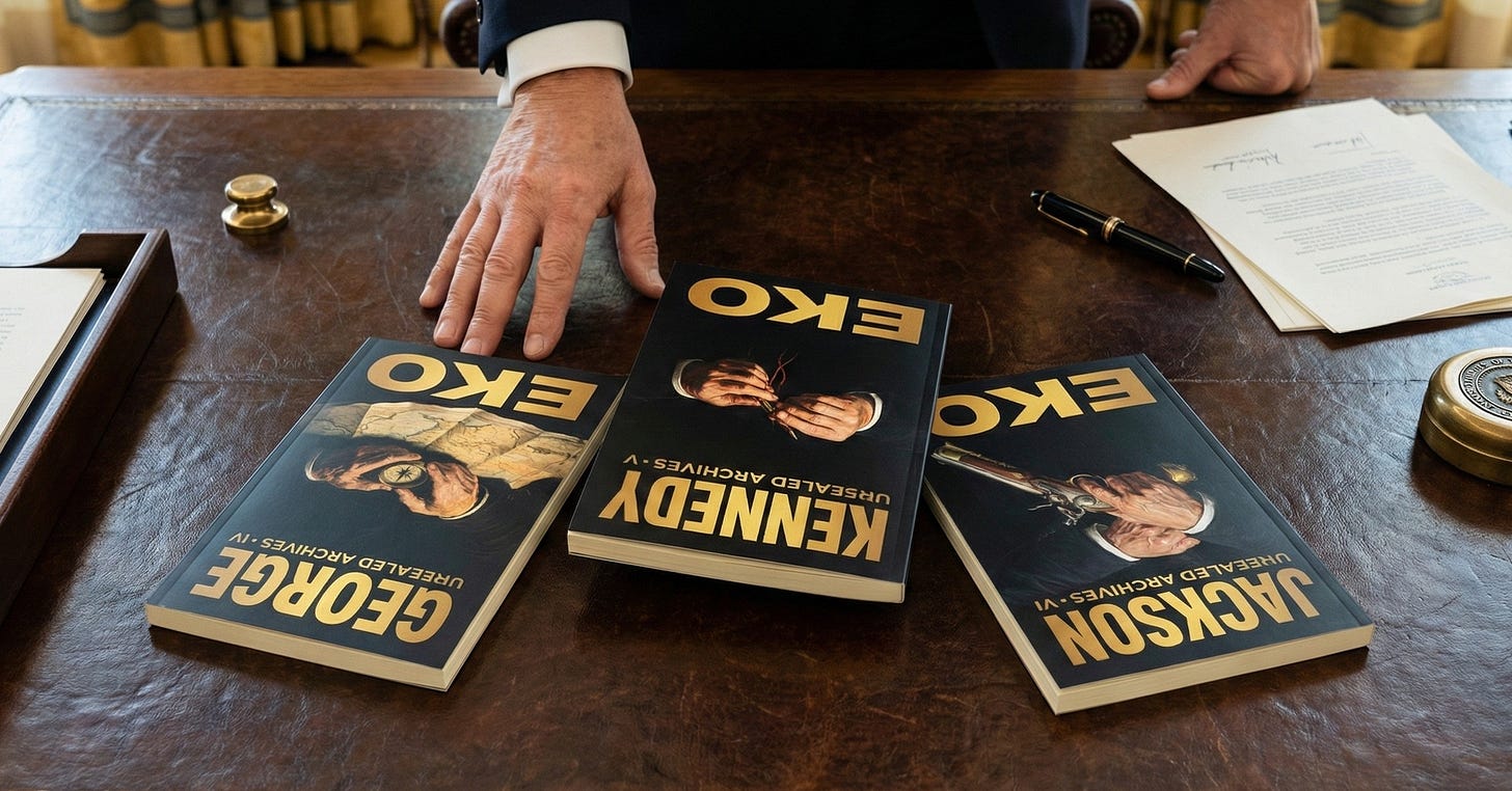 Sixty-three years of JFK books have given you the grassy knoll, the magic bullet, Oswald, Ruby, the mob, the CIA. An endless loop of whodunit that never resolves because it was never designed to resolve. The question “who killed Kennedy?” is a hamster wheel. It keeps you running. It keeps you looking at Dallas.