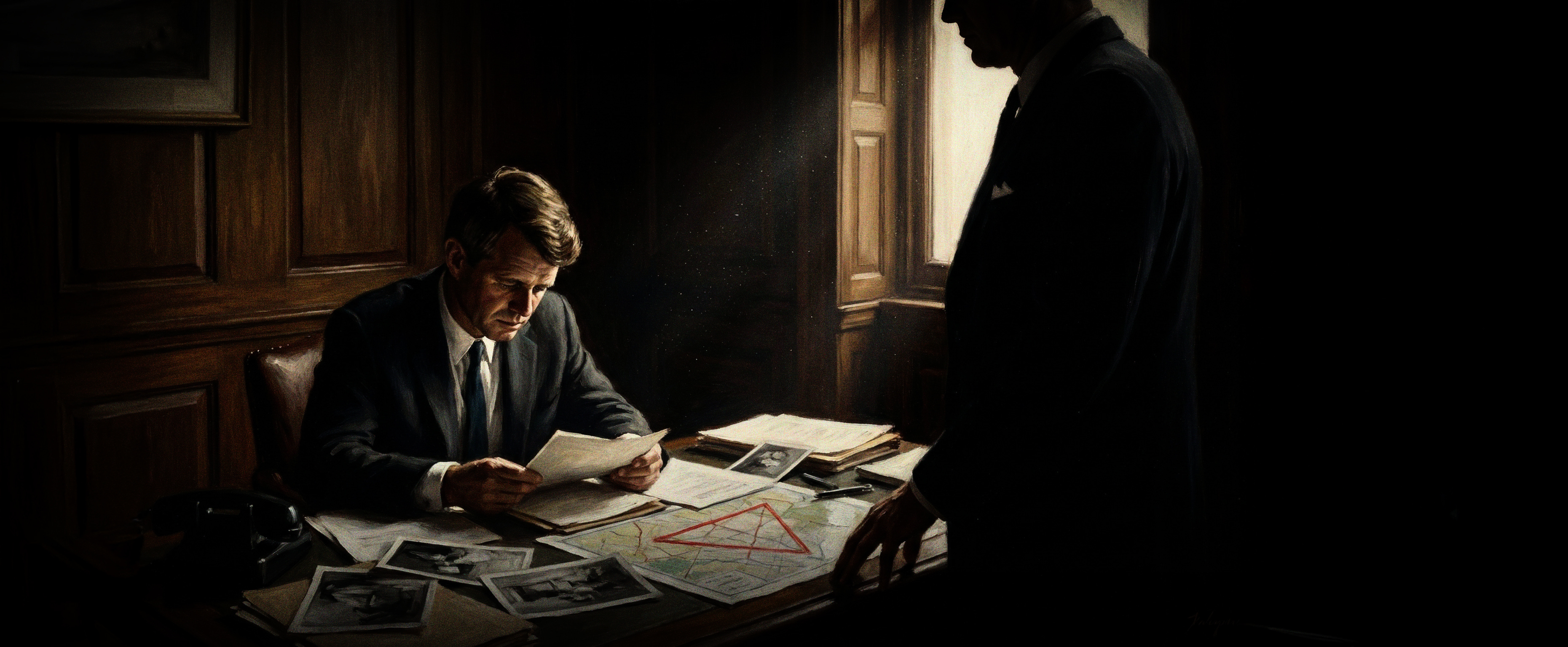 The kitchen smelled of cold coffee. Bobby Kennedy sat at the table, older than his years. Photographs lay scattered like a mosaic of obituaries.