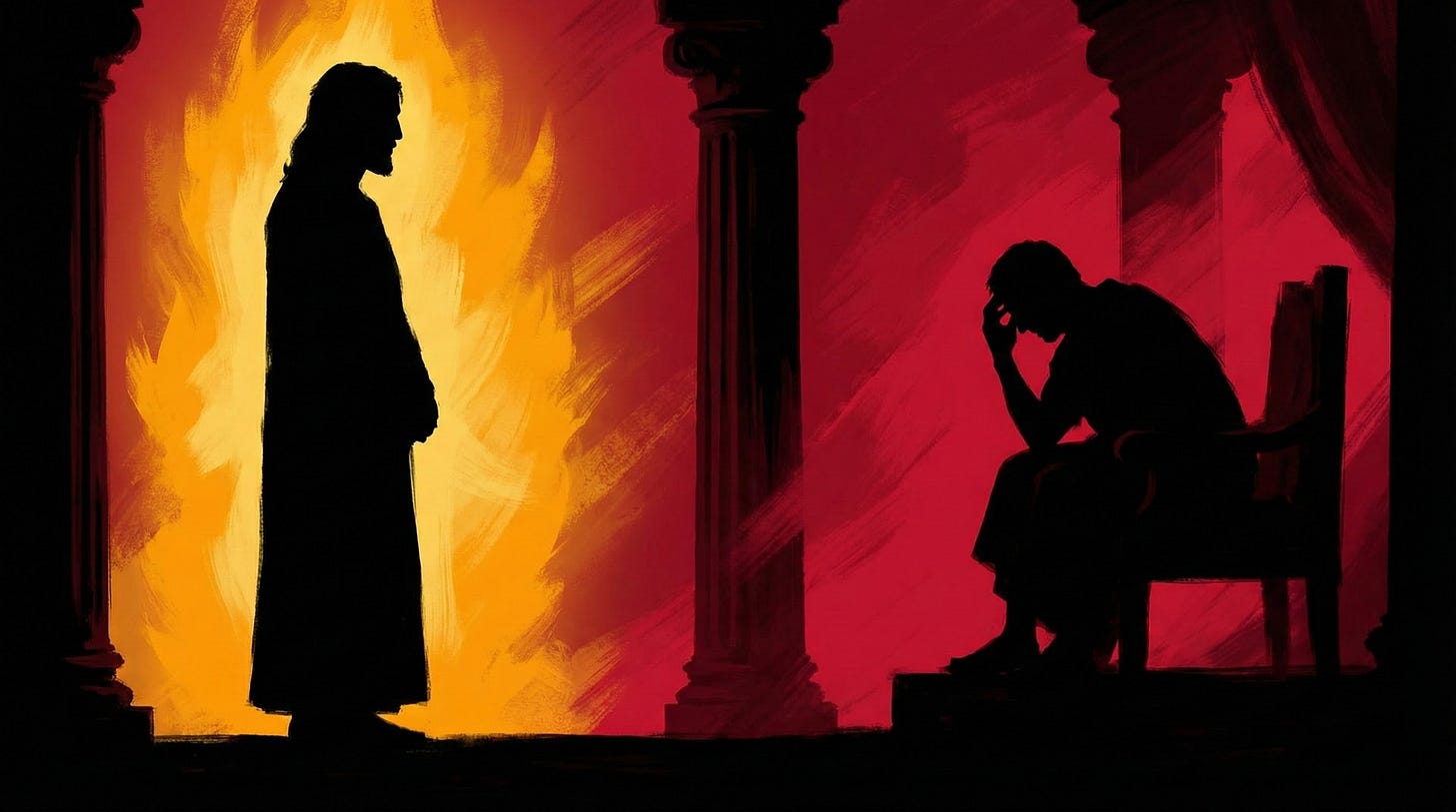 The Roman governor knows the script: prisoners beg, bargain, and break. Jesus stands unhurried while the most powerful man in the province sweats. The prisoner holds more frame than the judge. This is power so concentrated it has no need to perform.