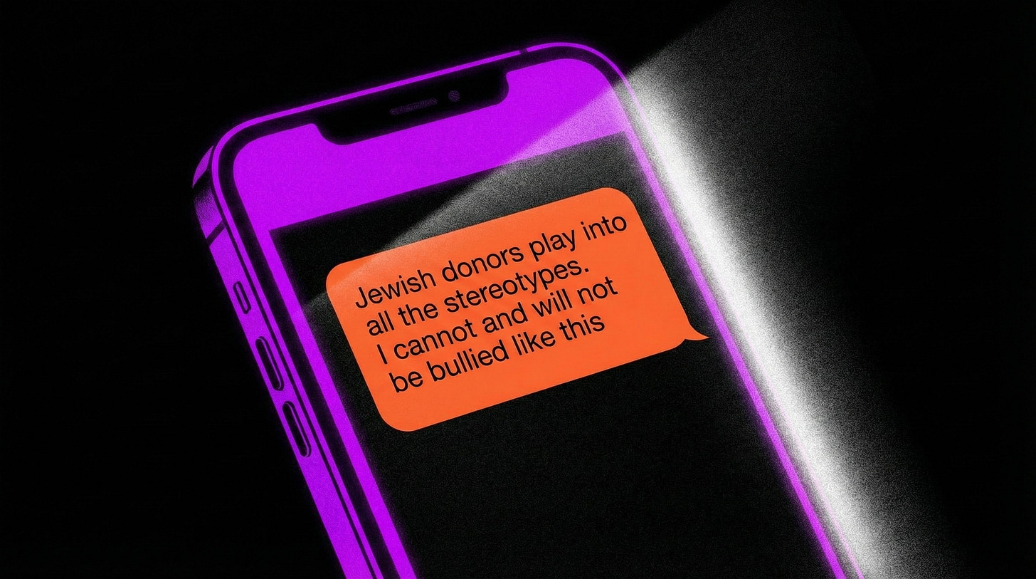 When pressed about the final texts regarding donor pressure, Erika deployed a focus-grouped line: “Jew hate is brain rot”.