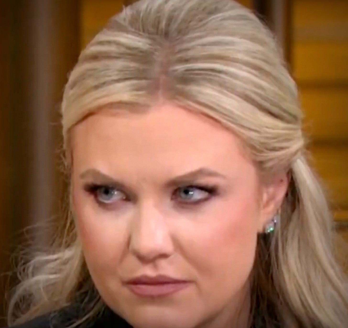 Grieving eyes collapse inward or soften. Fixed, intense eye contact during vulnerability signals a desire for control. Her nervous system wasn’t activated by the tragedy. It was activated by the threat of exposure.